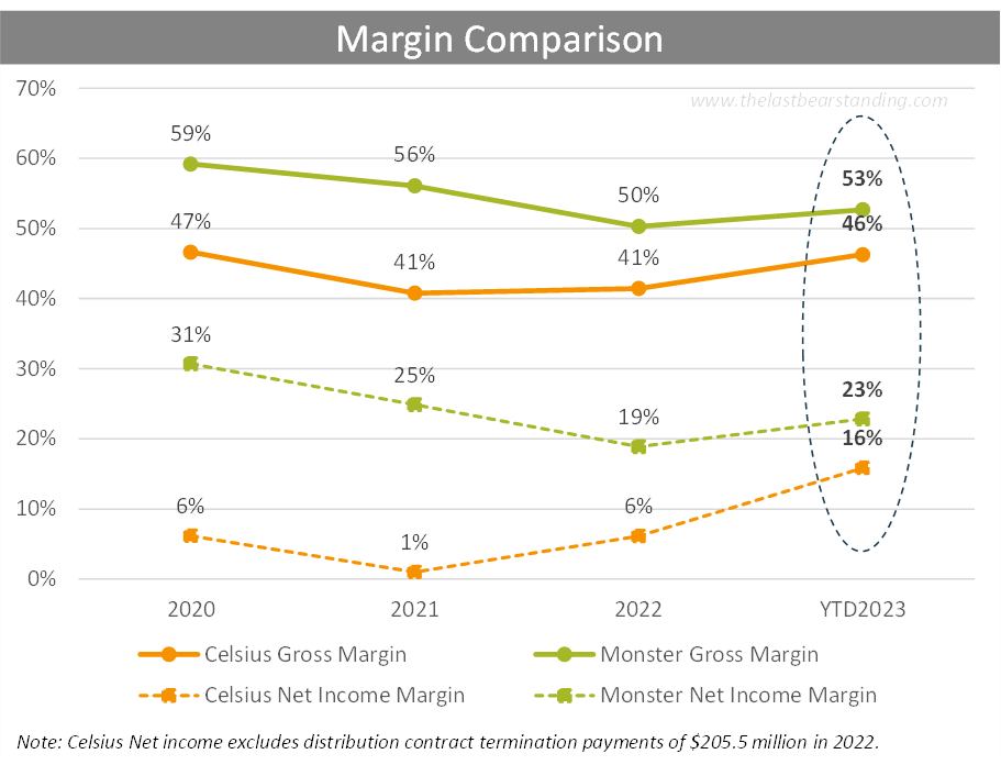 Topline growth has led to expanding profit margins, which are beginning to approach Monster’s leading standard. Further economies of scale should help Celsius as it attempts to close the remaining profitability gap.