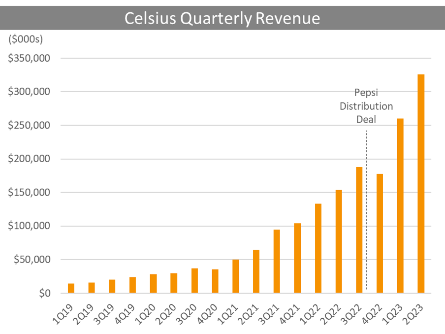 While Celsius does not provide forward guidance, it has given winks and nods that 3Q 2023 results will not disappoint. Real-time tracking data suggest triple-digit revenue growth that has accelerated throughout the quarter. As of mid-September, IRI data showed 144% year-over-year growth1. Meanwhile Nielsen data from the end of September reportedly shows 127% volume growth and 18% price growth for 165% YoY revenue growth (Monster volumes were down in this flash).