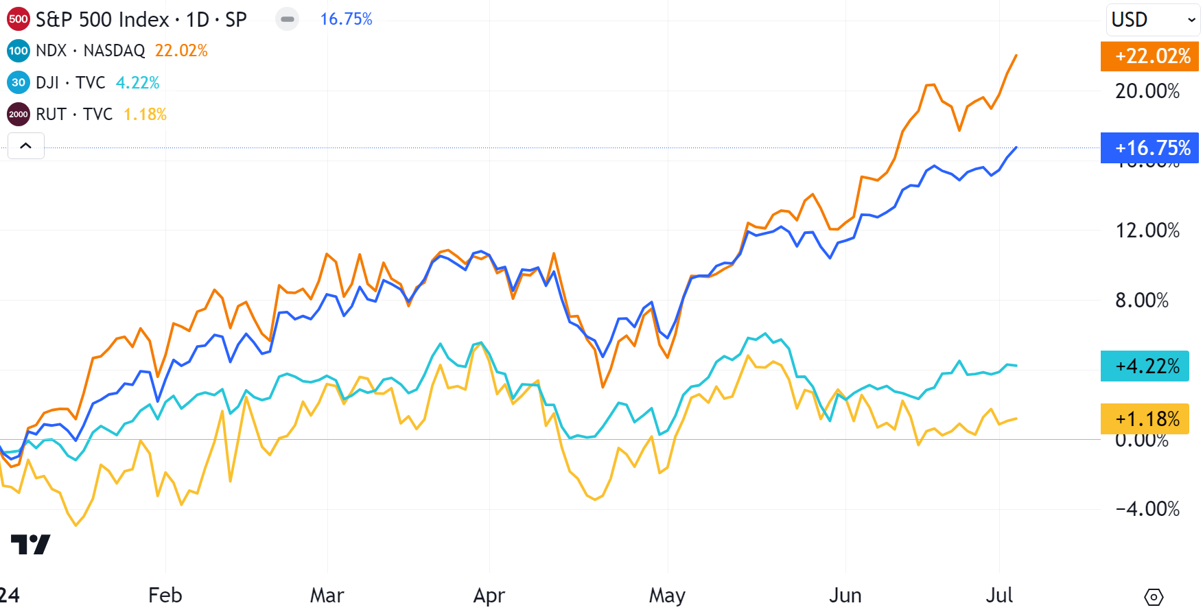 All major U.S. equity indices have notched positive performance, but the outsized returns of the Nasdaq and S&P 500 have been driven by the outperformance of mega-cap tech. The equal-weighted large-cap Dow Jones has provided only a marginal premium to the risk-free rate, while the small-cap Russell 2000 is nearly unchanged.