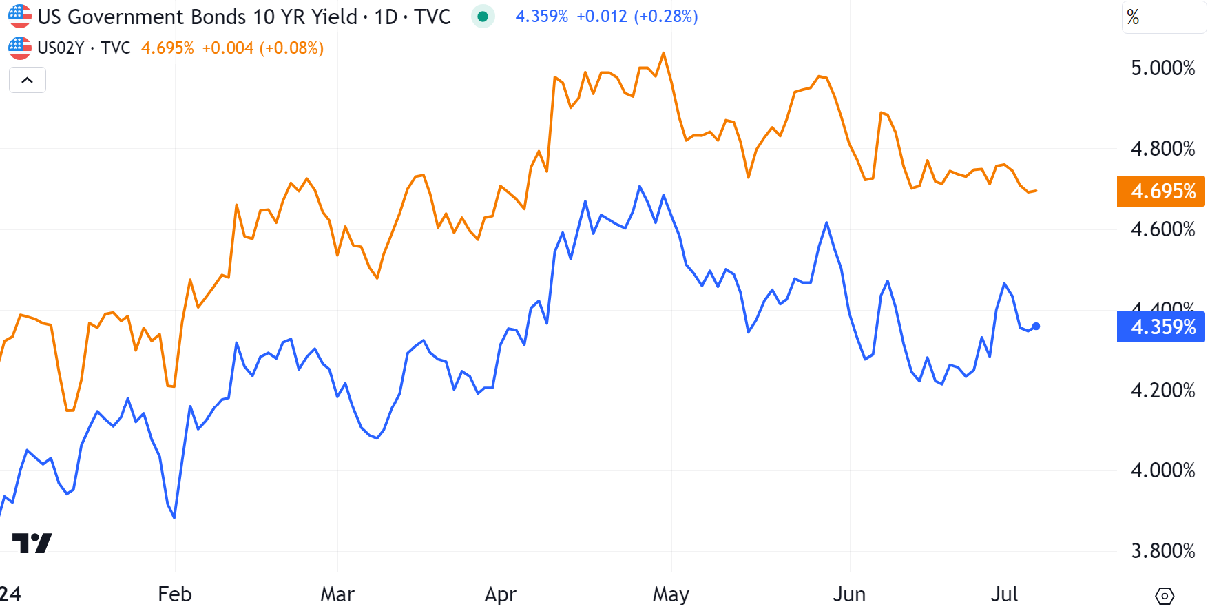 A series of hot inflation prints pushed U.S. Treasury yields higher through April — the likely culprit behind the only meaningful stock slump of the year. But cooler price prints combined with some growth concerns over the past two months have taken the edge off as bonds across the curve have rallied. The 10yr - 2yr spread has remained inverted for two full years — the longest streak in data going back to the mid-1970s — and shows few signs of reverting.