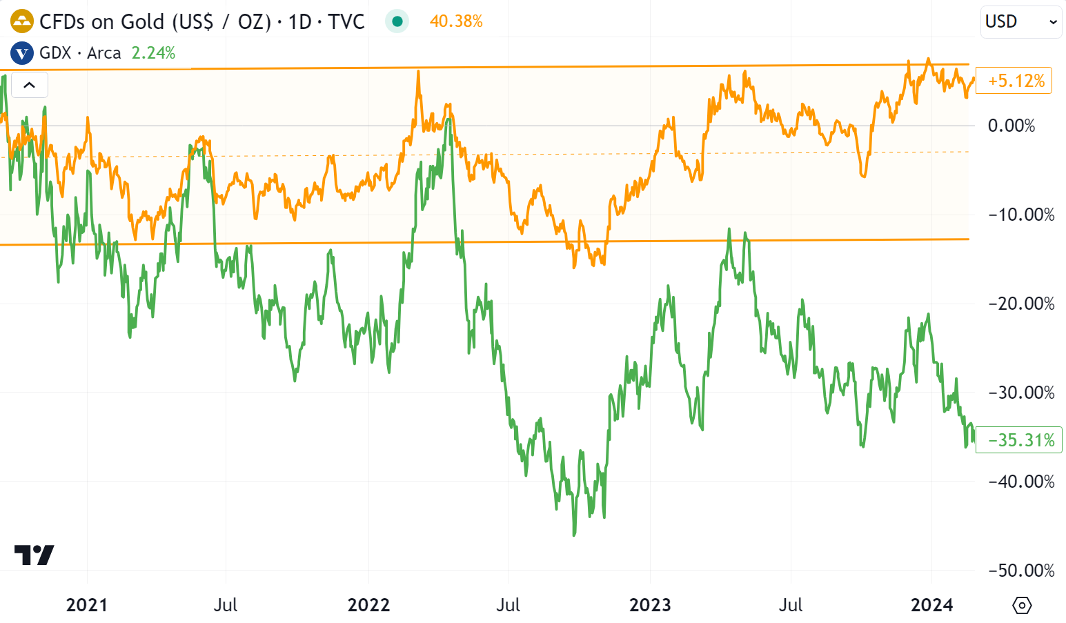 But rising operating costs and capital requirements can offset the benefit of higher commodity prices. Over the past several years, increased costs for energy, capital equipment, and labor have significantly impacted mining earnings and stock prices, even while gold prices remained relatively stable from late 2020 to 2023.